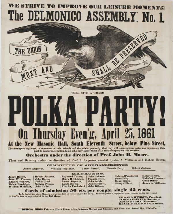 We strive to improve our leisure moments! : The Delmonico Assembly No. 1. will give a grand polka party! On Thursday even'g, April 25, 1861 at the New Masonic Hall, South Eleventh Street, below Pine Street, The managers beg leave to announce to their friends and the public generally, that they will spare neither pains nor expense on their part to render satisfaction to all who may favor them with their company on this occasion. Orchestra under the direction of Prof. John H. Moore. Floor and dancing under the direction of Prof. J. Augustus, assisted by Jas. A. Williams and Robert Brown. ... Cards of admission 50 cts. per couple, single 25 cents. To be had of the above managers, or at the door on the evening of the party. Sufficient police is engaged to preserve order during the evening. N.B.--No hats or caps allowed in the ball room. / Edward Winrow, president. James Augustus, secretary. James Brown, treasurer. Henry B. Fletcher, Marshall.