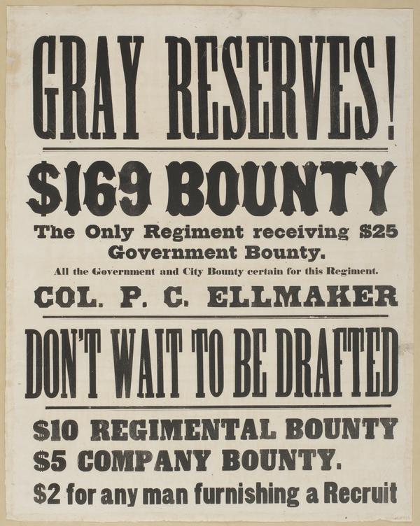 Gray Reserves! : $169 bounty The only regiment receiving $25 government bounty. All the government and city bounty certain for this regiment. Col. P.C. Ellmaker Don't wait to be drafted $10 regimental bounty $5 company bounty. $2 for any man furnishing a recruit