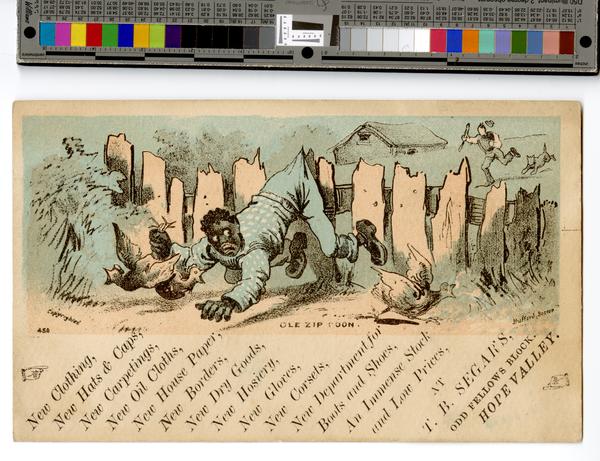 Racist trade card illustration depicting an African American man being chased by a white man and a dog. The African American man hangs by the seat of his pants on the jagged picket of a fence behind him. He holds a chicken in his right hand and watches a second chicken escape from him. He is attired in a blue and white striped shirt, blue pants, and shoes. The white man carries a gun in his right hand and runs as his hat flies off his head. A house is visible in the background. The African American man is depicted with exaggerated features.