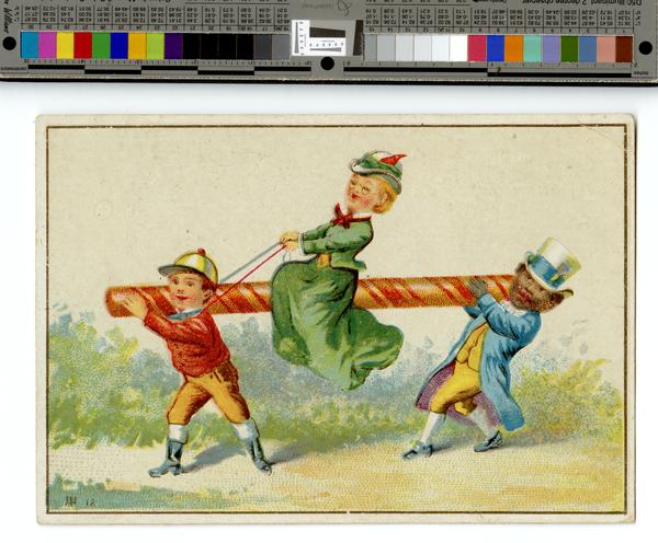 Racist, trade card specimen depicting a white woman sitting on a candy stick being carried by a white man jockey and an African American man. Shows the blond-haired, white woman, attired in a white hat decorated with a green band and red feather; spectacles; a white collared shirt; a red bowtie; and a green jacket and skirt, sitting on top of an oversized, striped red and yellow candy stick. She holds reins in both of her hands that are wrapped around the white man jockey, attired in a white and yellow striped jockey cap; a white collared shirt; a blue bowtie; a red jacket; beige breeches; and black boots, who is carrying the front of the candy stick on his right shoulder. The African American man, portrayed in caricature and attired in a white top hat with a blue band; a white bowtie; a blue jacket; a yellow waistcoat and pants; white socks; and buckled shoes, carries the back end of the candy stick on his right shoulder.