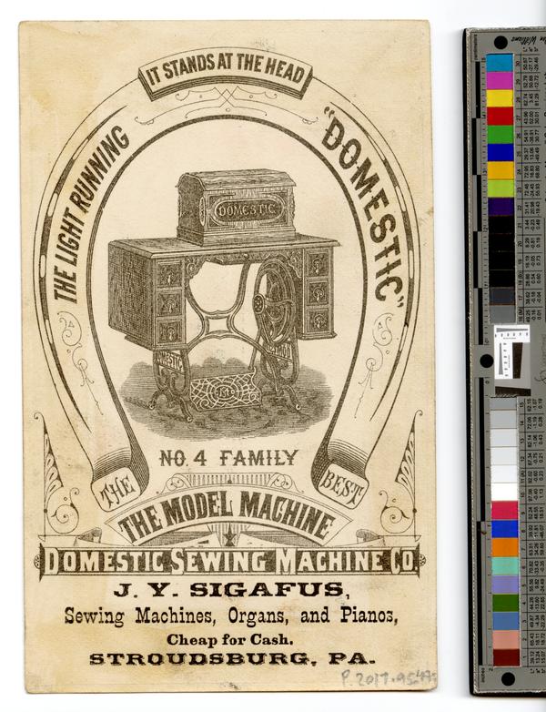 Distributor's imprint printed on verso: J.Y. Sigafus, Sewing machines, organs, and pianos, cheap for cash. Stroudsburg, PA. |