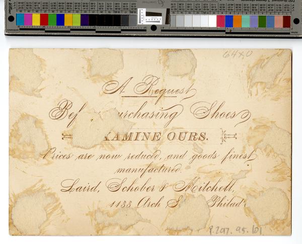 Advertising text on verso: A Request, [Before] purchasing Shoes Examine Ours. Prices are now reduced and goods finest manufactured.