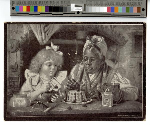 with a white girl. Shows an African American woman domestic attired in a head kerchief, spectacles, a patterned shawl, and