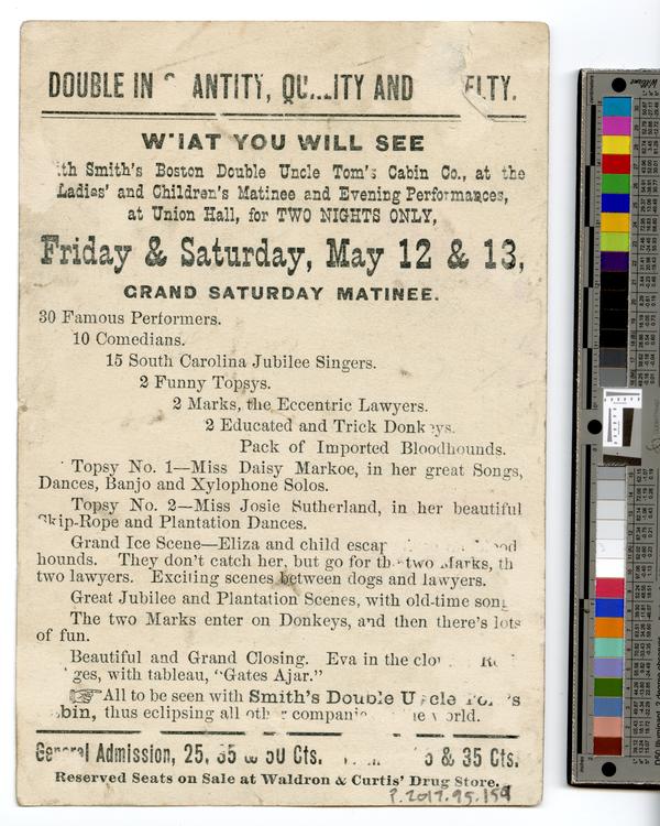 Advertising text on verso: Double in quantity, quality and [illegible]. [illegible] Smith's Boston Double Uncle Tom's Cabin