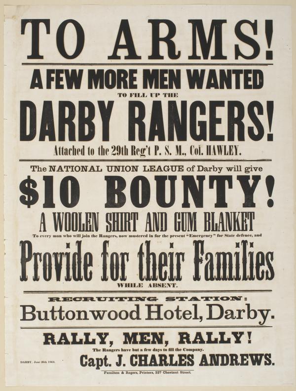 To arms! A few more men wanted to fill up the Darby Rangers! : Attached to the 29th Reg't P.S.M., Col Hawley. The National Union League of Darby will give $10 bounty! A woolen shirt and gum blanket to every man who will join the rangers, now mustered in for the present "Emergency" for state defence, and provide for their families while absent. Recruiting station, Buttonwood Hotel, Darby. Rally, men, rally! The rangers have but a few days to fill the company. / Capt. J. Charles Andrews. Darby, June 26th 1863