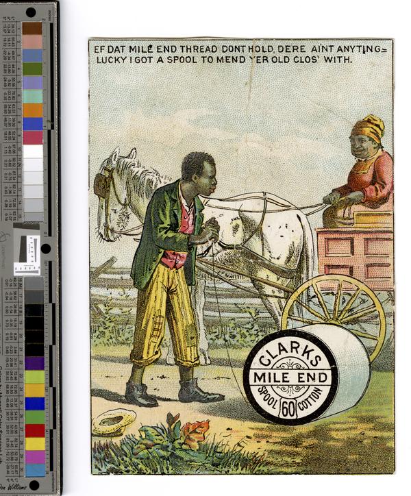 Racist trade card promoting Clark Thread Company and depicting a genre scene of an African American man and woman in conversation