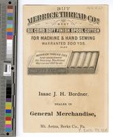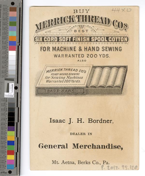 Distributor's imprint printed on verso: Isaac J.H. Bordner, Dealer in General Merchandise, Mt. Aetna, Berks Co., Pa. |
