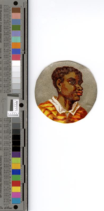 Circular shaped scrap depicting a racist caricature an African American woman with gold earrings. Shows the bust-length portrait of the woman facing to the right. She is attired in an orange and red striped shirt with a white collared shirt underneath it, a gold pin or button in the center of the collar, and gold hoop earrings.