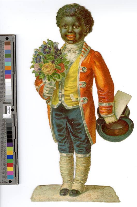 Scrap depicting a racist caricature of an African American boy butler. Shows the full-length portrait of the boy attired in a white shirt and bowtie, a yellow waistcoat, an orange jacket with tails, white gloves, blue pants, and white and black boots. He smiles as he carries a bouquet of flowers in front of him in his right hand. He holds a black top hat and a letter in his left hand.