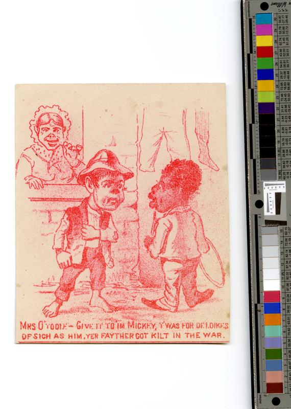 Racist trade card specimen depicting an Irish boy portrayed in caricature preparing to fight an African American boy portrayed in caricature. Shows the Irish mother, Mrs. O’Toole, attired in a bonnet, a polka dotted scarf, and a long-sleeved shirt, holding a pipe in her left hand and leaning out of a window. She speaks in the vernacular to her son, Mickey, that "t’was for de loikes of sich as him, yer fayther got kilt in the war." In the center outside of the house, the barefooted son Mickey, attired in a hat, a torn long-sleeved shirt, a vest, and pants, holds his left hand in front of his chest as he angrily looks at the African American boy in the right. The African American boy carries a hoop and stick toy in his hands and opens his mouth in alarm. In the background, clothes hang from a clothesline.