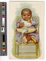 Racist trade card illustration depicting a vignette of a smiling African American infant sitting in a yellow high chair. A cup of water is overturned on the table attached to the high chair and water spills over the edge. The baby gestures toward the cup with her right hand puts her left index finger in her mouth. The barefoot child is attired in a blue, red, and white plaid dress and a white bib with red embroidery. Lily White flour was manufactured by the Valley City Milling Company, which was established in 1884 and eventually became known as the Grand Rapids Roller Mills.