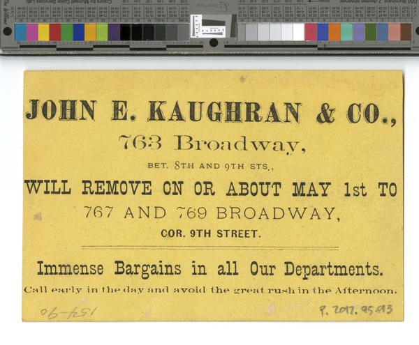 Advertising text printed on verso: John E. Kaughran & Co., 763 Broadway, Bet. 8th and 9th Sts., will remove on or about May