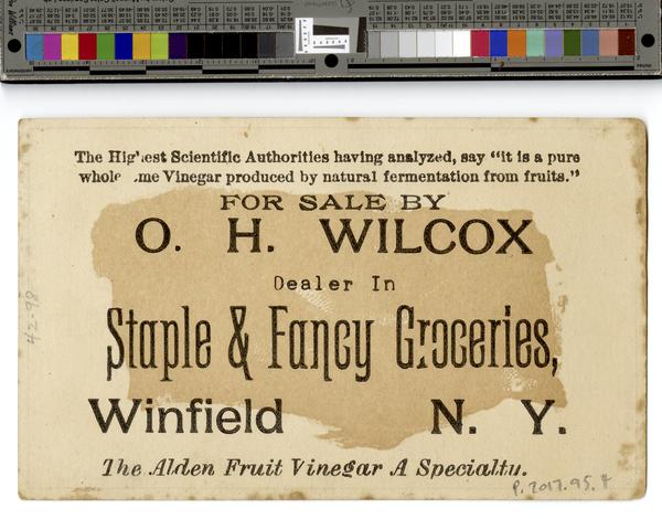 Distributor's name on verso: O. H. Wilcox, dealer in simple & fancy groceries, Winfield, N.Y. |