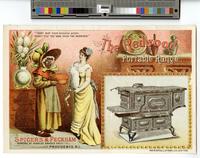 Racist trade card illustration depicting an interior scene with an African American woman delivering a loaf of bread to a well-dressed white woman. The African American woman is attired in a large yellow and green hat with a wide brim, a white bonnet with a green ribbon tied underneath her chin, a red shawl draped across her shoulders, a green and yellow long sleeved dress, a green apron, and brown shoes. The white woman is attired in a yellow dress lined with white and a blue ribbon attached to the back. She wears a blue hairpiece and holds a white fan in both hands. Visible in the background are a set of drawers, on top of which sits a large vase with flowers and cattail plants, and a larger partially obscured drawer in the right of the image with a large decorative plate, a vase, and an urn on top of it. A bordered image featuring a Redwood stove is superimposed over the drawer in the right. The African American woman is depicted with exaggerated features.