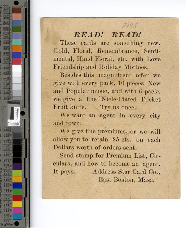 Advertising text printed on verso: Read! Read! These cards are something new, Gold Floral, Rememberance, Sentimental, Hand