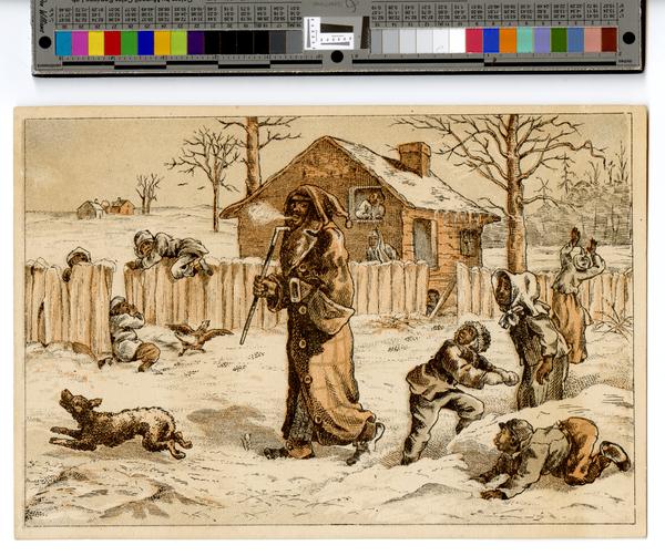 Racist trade card depicting a snowy scene with several African American figures. At the center of the image is an African