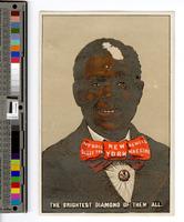 Racist trade card illustration promoting the New York Sewing Machine Company and depicting a bust length portrait of an African American man. The man is attired in a white collared shirt, a large red bowtie which bears the advertising text, a dark colored jacket, and a reflective diamond pin. The New York Sewing Machine Company was founded in 1880 and became the Demorest Manufacturing Company, which was based in Plattsburgh, New York and operated between 1882 and 1908.