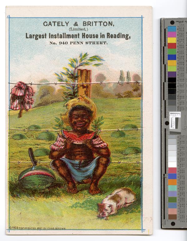 Racist trade card promoting Gately & Britton's home furnishing store in Reading, Pa. and depicting a caricature of an African American boy sitting against a fence post eating a large slice of watermelon. Shows the boy squatting on his toes and smiling at the viewer as he holds a piece of watermelon in both hands. He has taken the melon out of a field of watermelon plants surrounded by a barbed wire fence. He is attired in a torn straw hat, blue shorts with a patch, and only the partial sleeves of a red and white striped shirt. The rest of the shirt has ripped and hangs from the barbed wire in the left. On the ground in the left is the watermelon with a slice cut from it with the handle of a knife protuding out of it. In the right is a small, white and brown dog. Edward Gately and G.M. Britton established a home furnishings store called Gately & Britton at 940 Penn Street, Reading, Pa. in 1887. The business continued operating into the 20th century.