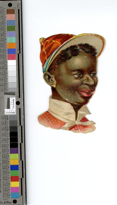 Die-cut scrap depicting a racist caricature of an African American man jockey attired in a red jockey cap with yellow stripes and a blue band, a white collared shirt and bowtie, a red jacket, and a gold earring. Shows the bust-length portrait of the man smiling and facing to the right.