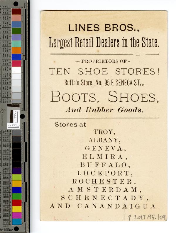 Advertising text on verso: Lines Bros., Largest Retail Dealers in the State Proprietors of Ten Shoe Stores! Buffalo Store,