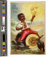 Racist trade card promoting J.&. P. Coats thread and depicting a caricature of an African American boy sitting on an oversized spool of thread in a field. Shows the boy seated and with his legs straddling a giant spool of black thread labeled, "J&P Coats best six cord 200 yds 50." He says “we never fade!!” and points his finger at the sun, which has a face and a concerned expression with a downward turned mouth. The boy is barefoot and attired in a white collared shirt with the sleeves rolled up to the elbows; a multi-colored tie and belt; and red pants rolled up to the knees. In the foreground, two black crows look at the thread. A house is visible in the right background. Brothers James Coats, Jr. (1803-1845) and Peter Coats (1808-1890) established the firm J.&P. Coats, a thread manufactory. Their brother Thomas Coats (1809-1883) joined the firm soon after. By 1840, three quarters of the British company’s business was with the United States. In 1896, the firm merged with thread manufacturer Clark & Co. and formed J. & P. Coats, Ltd. In 2015, the firm was renamed, “Coats Group.”