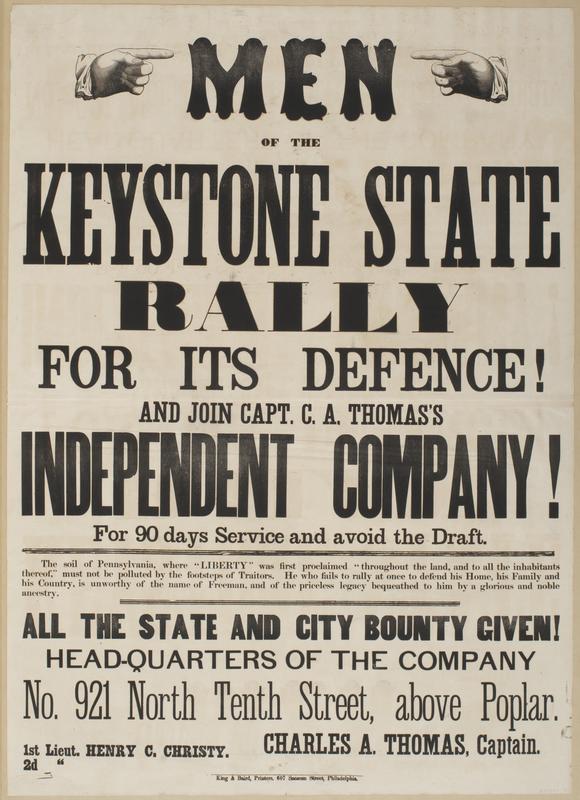 Men of the Keystone State rally for its defence! : And join Capt. C.A. Thomas's independent company! For 90 days service and avoid the draft. The soil of Pennsylvania, where "Liberty" was first proclaimed "throughout the land, and to all the inhabitants thereof," must not be polluted by the footsteps of traitors. He who fails to rally at once to defend his home, his family and his country, is unworthy of the name of freeman, and of the priceless legacy bequeathed to him by a glorious and noble ancestry. All the state and city bounty given! Head-quarters of the company No. 921 North Tenth Street, above Poplar. / 1st Lieut. Henry C. Christy. 2d " [blank] Charles A. Thomas, Captain.