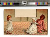 Racist, trade card specimen depicting a caricature of an African American girl laughing with an infant on her lap. In the right, shows the African American girl, attired in a red and white checked dress, sitting on the floor. She tilts her head back in laughter as she holds a white infant, attired in a white layette and a triangular paper hat. In the left, a blond-haired white girl, attired in a white dress and red shoes, looks on.
