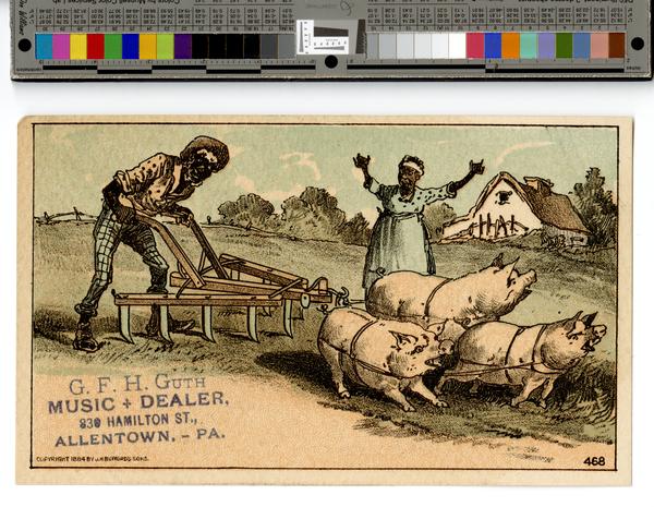 Racist trade card promoting G.F.H. Guth's musical instruments retail store and depicting a caricature of an African American