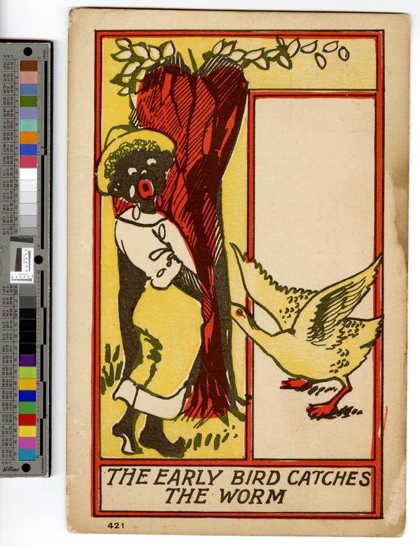 Racist post card depicting a satiric caricature of an African American man urinating behind a tree and a goose biting him.