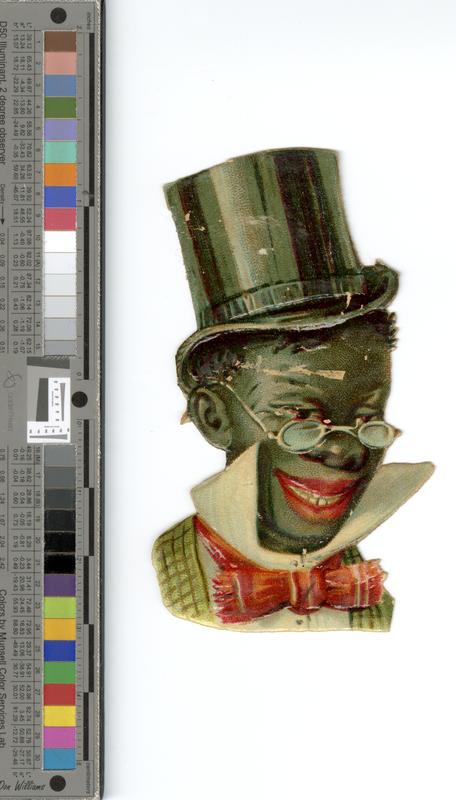 Die-cut scrap depicting a racist caricature of an African American man attired in spectacles, a black top hat, a white shirt with an oversized collar, a red bowtie, and a plaid, beige jacket. Shows the bust-length portrait of the man smiling as he looks down.
