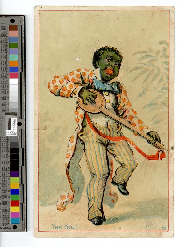 Racist, trade card specimen depicting a caricature of an African American man minstrel playing a banjo. Shows the African