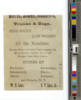 Advertising text on verso: Boots, shoes, rubbers, trunks & bags. Good goods! Low prices! All the novelties. Buying direct
