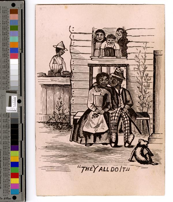Racist trade card specimen depicting a caricature of an African American man kissing a caricature of an African American woman on a bench in front of a house while people look on. Shows the African American man, attired in a hat, a white collared shirt, a waistcoat, a black jacket, plaid pants, and shoes, sitting on a bench. He carries a stick in his left hand and wraps his right arm around the African American woman’s neck and kisses her cheek. The woman, attired in a long-sleeved dress and apron, sits next to the man on the bench. She holds a flower in her hand on her lap and smiles. In the house behind the bench, a man, a woman, and a boy look down and smile at the couple from the second story window. In the left, a boy, attired in a hat, a long-sleeved shirt, and pants with a suspender, sits on the wooden fence with his back turned to the viewer. In the foreground is a dog scratching its ear.