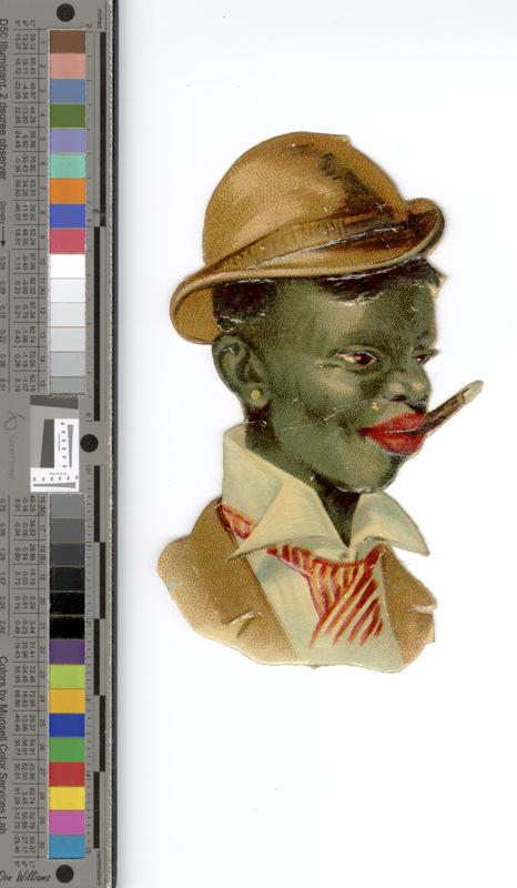 Die-cut scrap depicting a racist caricature of an African American man attired in a brown hat, a white collared shirt, a red and white striped tie, a brown jacket, and a gold earring. The bust-length portrait of the man faces right as he smokes a cigar.