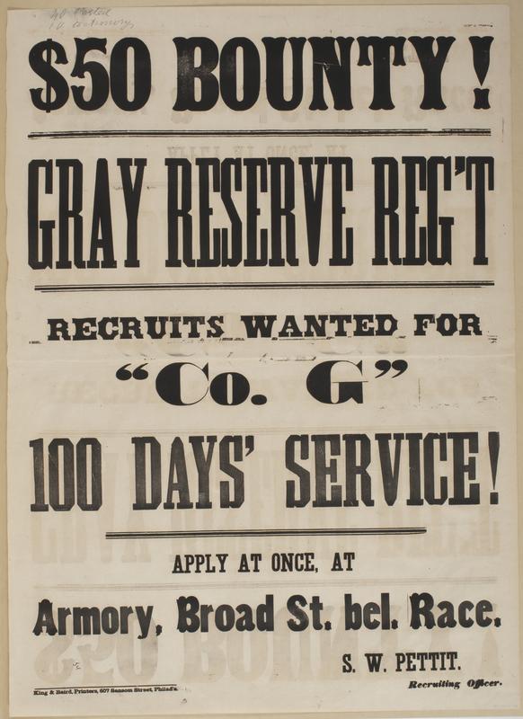 $50 bounty! Gray Reserve Reg't : Recruits wanted for "Co. G" 100 days' service! Apply at once, at Armory, Board St. bel. Race. / S.W. Pettit. Recruiting officer.