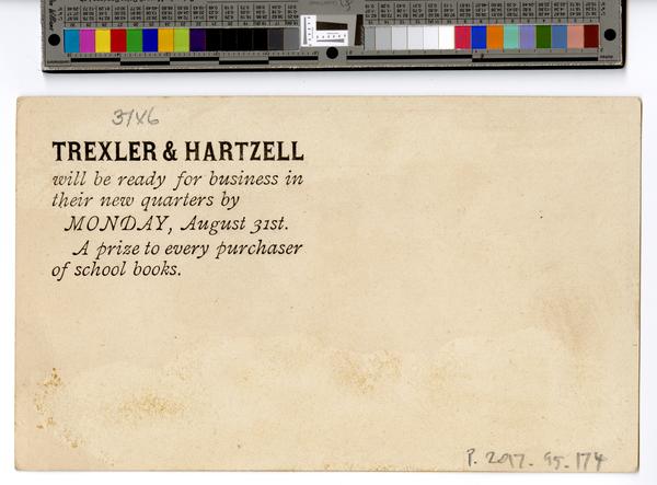 Text printed on verso: Trexler & Hartzell will be ready for business in their new quarters by Monday, August 31st. A prize