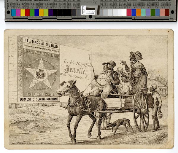 Racist trade card promoting Domestic Sewing Machine Company and depicting a caricaturized genre scene of an African American family looking to their right at a billboard on the side of a building. The figures are portrayed with exaggerated feaures. Shows an older, squat man, a woman, and three children seated and standing in a horse-drawn cart halted on a dirt road. An older boy stands behind the cart. The man, attired in a top hat; a ragged jacket; a shirt with bowtie; and pants with patches on the knees and suspenders sits smiling and holding in his hands a stick and the reins of his horse that wears blinders. The woman, attired in spectacles; a straw hat with a decorative ribbon that is tied under her chin in a bow; a long-sleeved dress; and a shawl stands up inside the cart. She holds a baby in her left arm and points at the billboard with her right hand. A boy attired in a long shirt and pants sits beside the man in the front of the cart. Behind the man, a girl attired in a bonnet stands. The boy outside of the cart is barefooted and attired in a cap; a shirt; and ragged pants with a hole at the knee, and carries a basket. A dog, its tail between its legs, hunches underneath the cart. In the left, the billboard is illustrated with a sewing machine in the center of a star with the advertising text around it. Text reads: "It stands at the head : Copyrighted by the "Domestic" Sewing Machine Co. The star that leads them all. Unequalled for simplicity of construction ease of operation and durability. The light running "Domestic" sewing machine." In the distant right background a house is visible. William S. Mack & Co. and N.S. Perkins founded the Domestic Sewing Machine Company in 1864 in Norwalk, Ohio. The White Sewing Machine Company bought the company in 1924.