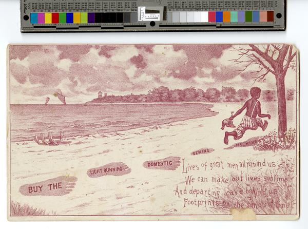 Racist trade card illustration depicting an African American boy running on a beach. Visible behind and beneath the boy are
