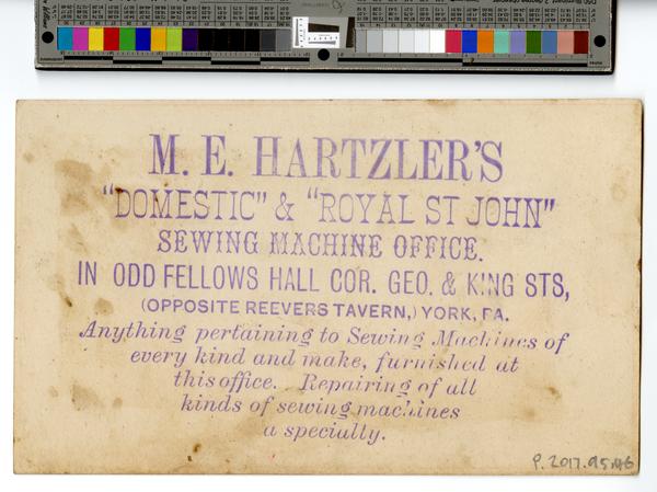 Distributor's imprint printed on verso: M.E. Hartzler's "Domestic" & "Royal St John" sewing machine office. In Odd Fellows