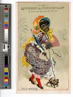 Racist trade card illustration depicting a full length portrait of an African American woman walking a small brown dog. The woman is attired in an elaborate orange, yellow, and green feathered bonnet, a blue and red dotted and frilled dress with white and blue details, a pendant, white and yellow fingerless gloves, red stockings, and black heeled shoes. She holds the dog's leash and a red and blue fan in her left hand and a blue parasol in her right hand. Visible behind her is a large yellow ribbon which is attached to the back of her dress. The woman leans forward while jutting out her backside and stands with her right foot in front of her left. The woman is portrayed with exaggerated features. Queen Anne Soap was owned by the Detroit Soap Company, which in 1915 was acquired by the Buffalo-based Lautz Bros. & Co.