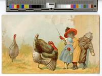 Racist trade card illustration depicting two African American girls and one boy standing near a fence and fending off two wild turkeys. The boy stands behind the two girls and is attired in a cap, a long brown coat, tan gloves, and black shoes. The older girl is attired in a red hat with a dark-colored ribbon, a yellow jacket, red gloves, red stockings, and black boots. She wields a stick in her right hand and holds the younger girl with her left. The younger girl is attired in a blue and white cap and a blue jacket. All of the children are depicted with exaggerated features. The Villa Park Improvement Company was based in New Jersey and James Moses, a Trenton businessman, was the organization's president during the 1890s.