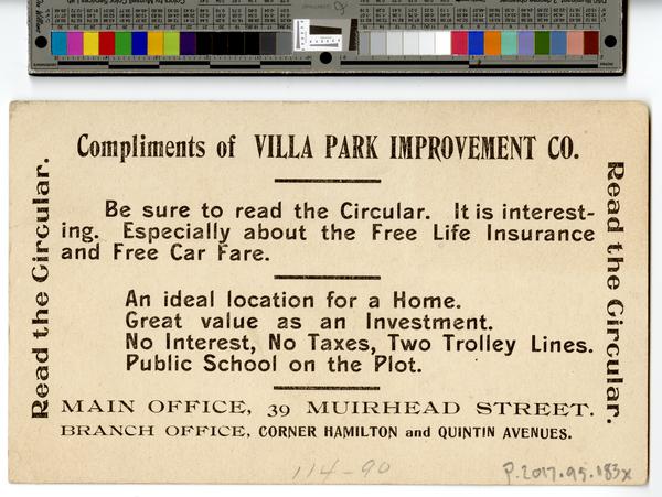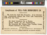 Advertising text on recto: Compliments of Villa Park Improvement Co. Be sure to read the circular. It is interesting. Especially