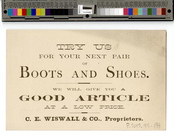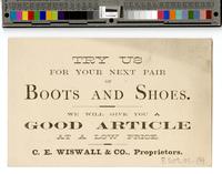 Advertsising text printed on verso: Try us for your next pair of boots and shoes. We will give you a good article at a low