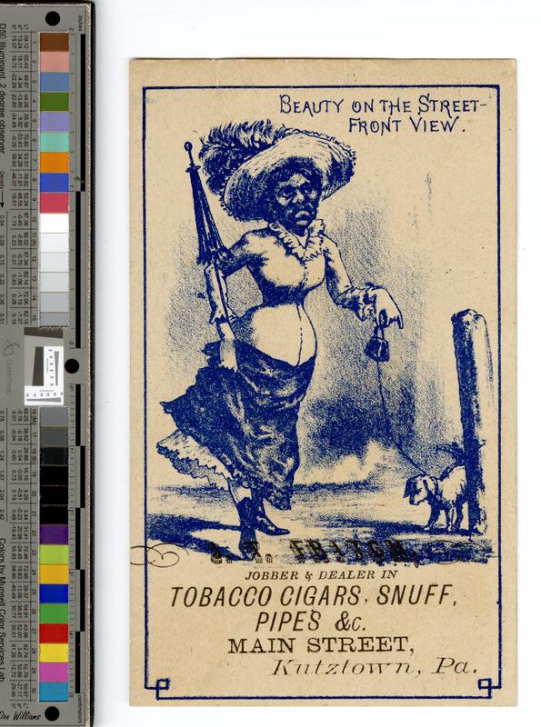 Racist trade card illustration depicting an African American woman walking her dog. The woman is attired in an elaborate feathered wide-brimmed top hat, a form-fitting jacket with a ruffled collar, a long skirt, petticoat, and boots. The woman holds an umbrella in her right hand and her dog's leash in her left. The dog appears to urinate behind a pole. The woman is depicted with exaggerated features. J.T. Fritch was a businessman based in Kurtztown, Pennsylvania who was trained as a printer, became a cigar manufacturer and dealer, and embarked on several other business ventures during the late 19th and early 20th centuries.