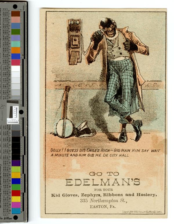 Trade card promoting Edelman's store and depicting a satiric, racist caricature of an older African American man misunderstanding an operator to whom he speaks on a wall-mounted telephone. He faces the viewer, leans against the wall, and remarks in vernacular speech "dis chile's rich...dis man... gib me de city hall." The man is balding and has tufts of hair on the sides of his head. He has a white beard and is attired in a beige coat, an undersized, green vest with buttons, and blue plaid pants rolled up at the bottom exposing his socks and black shoes. On the ground beside his feet is a banjo and brimmed hat. M.A. Edelman had a shoe store on 146 Northampton Street, Easton, PA circa 1871. Circa 1880s, he opened a store selling women's accessories on 335 Northampton Street.