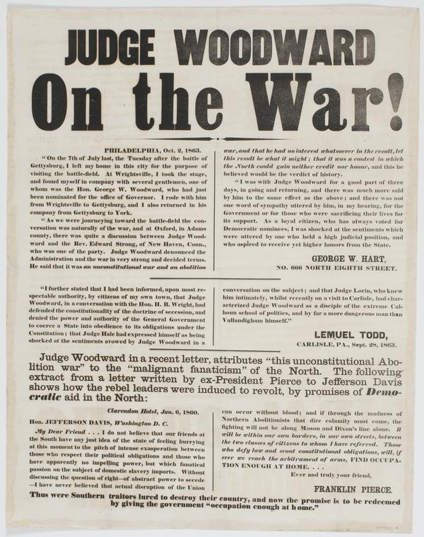 Judge Woodward on the war! : ... Judge Woodward in a recent letter, attributes "this unconstitutional abolition war" to the "malignant fanaticism" of the North. ... Thus were Southern traitors lured to destroy their country, and now the promise is to be redeemed by giving the government "occupation enough at home."