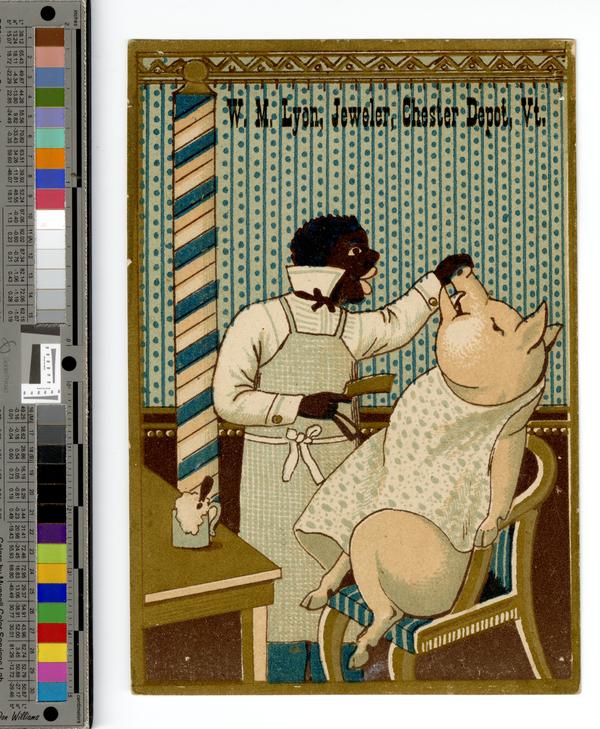 Racist trade card depicting a comic scene showing an African American barber shaving a pig in a barber shop. The barber, in the left,is depicted holding a razor in his right hand and the pig's snout in his left. The man is attired in a white shirt with turned up collar, a black bowtie, a green and white checkered apron, and blue pants. The pig, seated chest out, leans back in the barber's chair. The animal wears a barber's cape. On a table next to the barber is a shaving mug filled with shaving foam and holding a shaving brush. The man is depicted with exaggerated features. W.M. Lyon worked as a jeweler in Chester Depot, Vermont beginning in 1877.