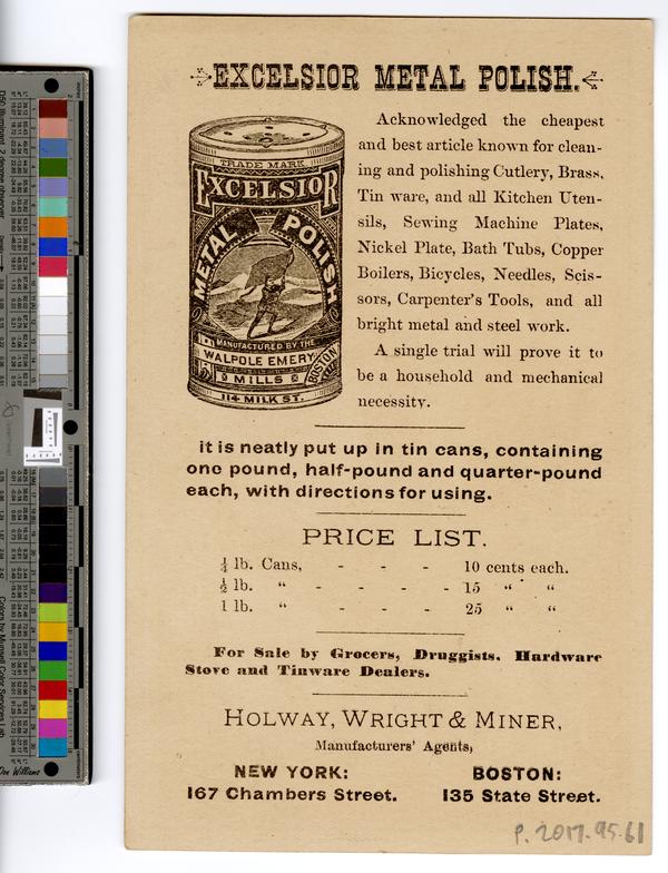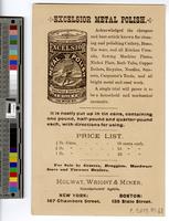 Advertising text printed on verso: Excelsior metal polish. Acknowledged the cheapest and best article known for cleaning and