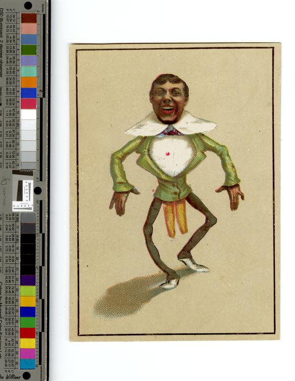 Racist, trade card specimen depicting a caricature of an African American man minstrel dancing. Shows the African American man, portrayed with exaggerated features and spindly arms and legs, attired in a white shirt with an oversized collar, a blue tie, a green jacket with tails, green pants, and white shoes. He smiles broadly with his arms pointed down and out to the sides and his left foot back in a dance step.
