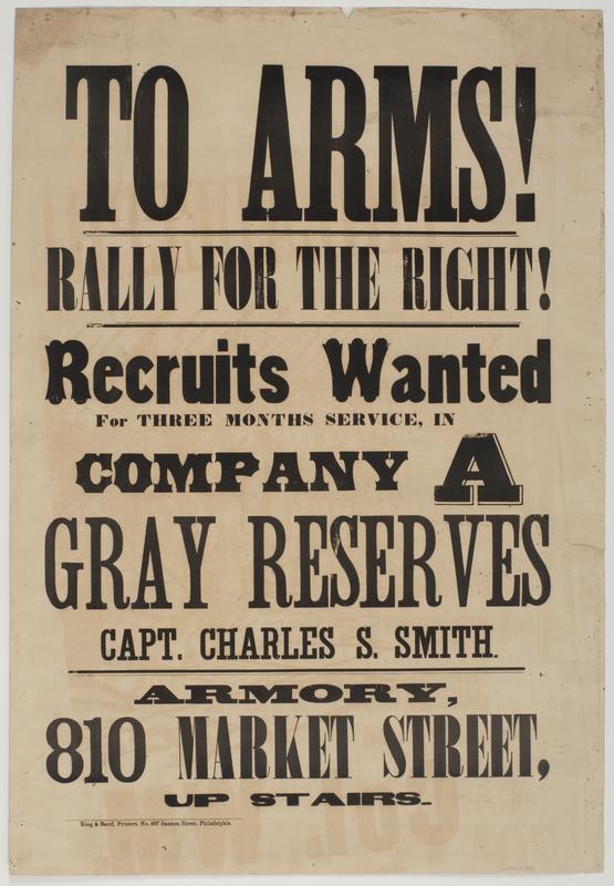 To arms! Rally for the right! : Recruits wanted for three months service, in Company A Gray Reserves Capt. Charles S. Smith. Armory, 810 Market Street, up stairs.